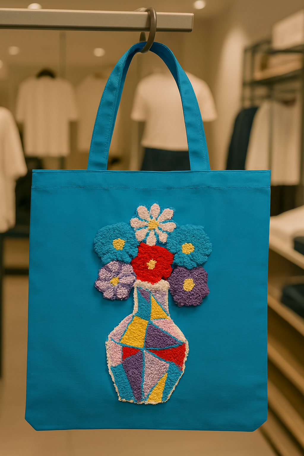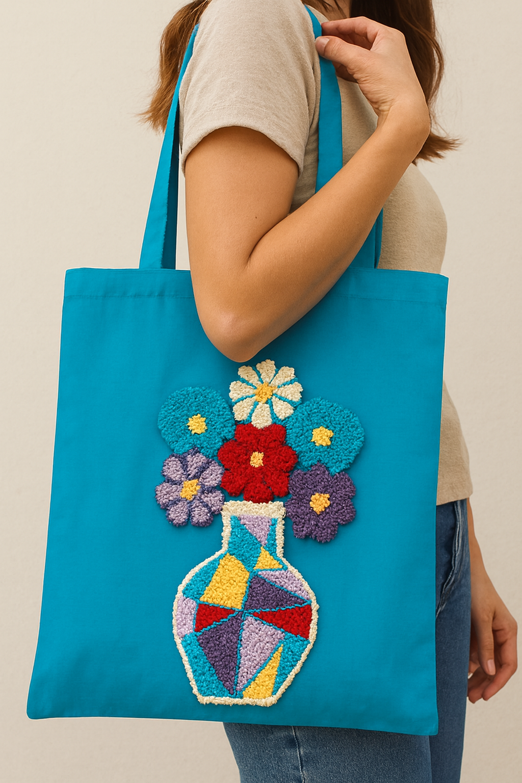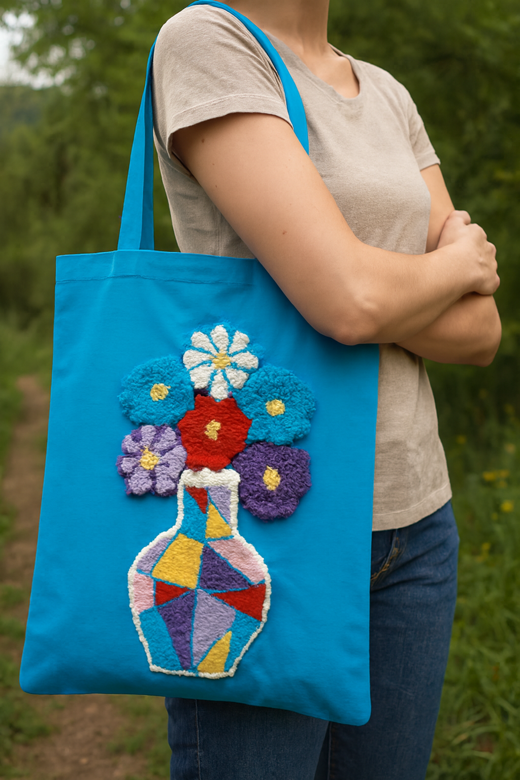 💙Mavi Çiçekli Çanta 🎉 Kadının kolunda taşıdığı o canlı mavi çanta, punch needle tekniğiyle işlenmiş çiçekli tasarımıyla şehirdeki sade ama şık tarzına harika bir dokunuş katıyor.