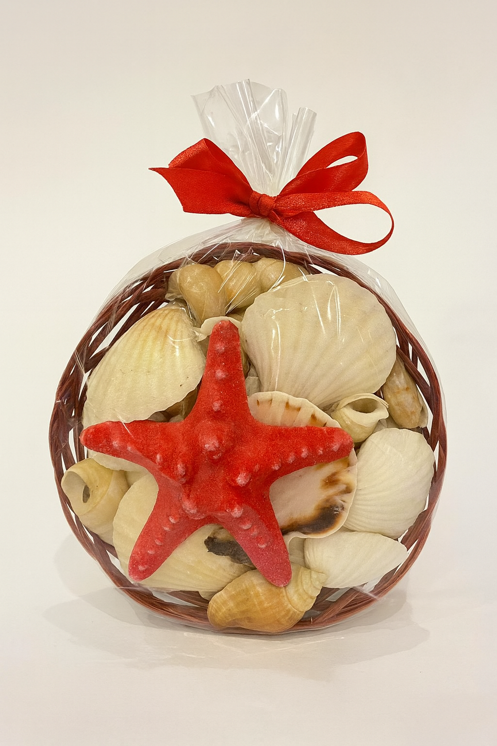 Yaşam alanlarınızda huzurlu bir sahil havası estirmeye ne dersiniz? Özenle seçilmiş doğal formlu deniz kabukları ve canlı kırmızı rengiyle dikkat çeken dekoratif deniz yıldızının, şık bir hasır sepet içindeki bu eşsiz uyumu, dekorasyonunuza sofistike bir dokunuş katacak.