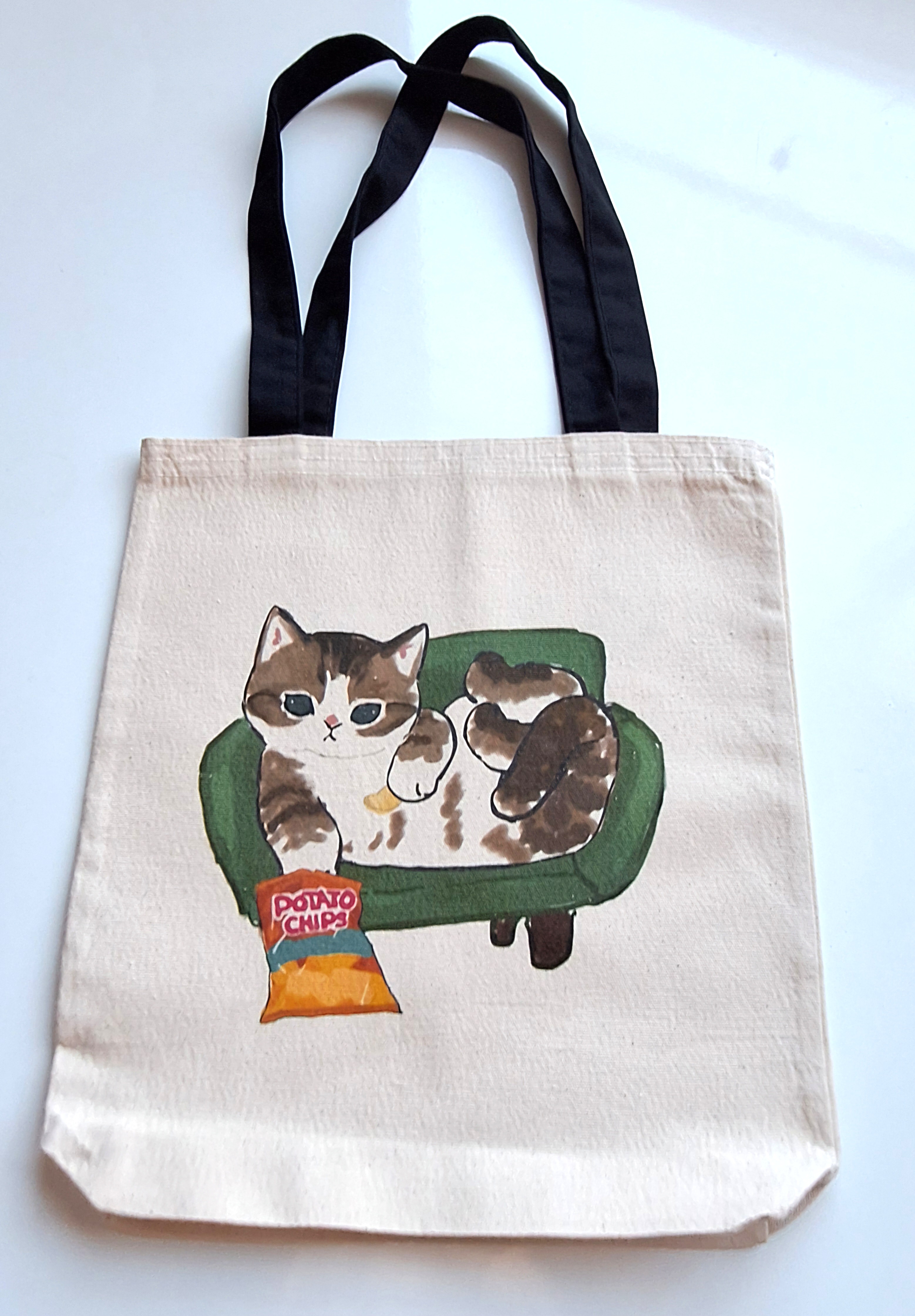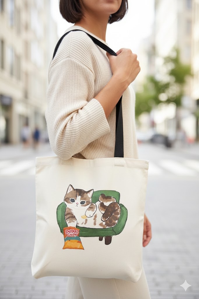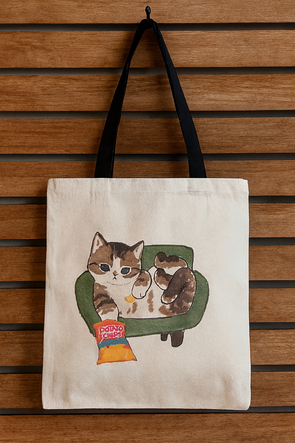 Hafta sonu modunu her an yanında taşımak isteyenler için tasarlanan bu özel bez çanta, hem stilinize hem de ruhunuza hitap ediyor. Yeşil koltuğuna yayılmış, elinde cipsiyle keyif yapan o meşhur "ev kedisi" ruhunu sokağa taşımaya hazır mısınız?