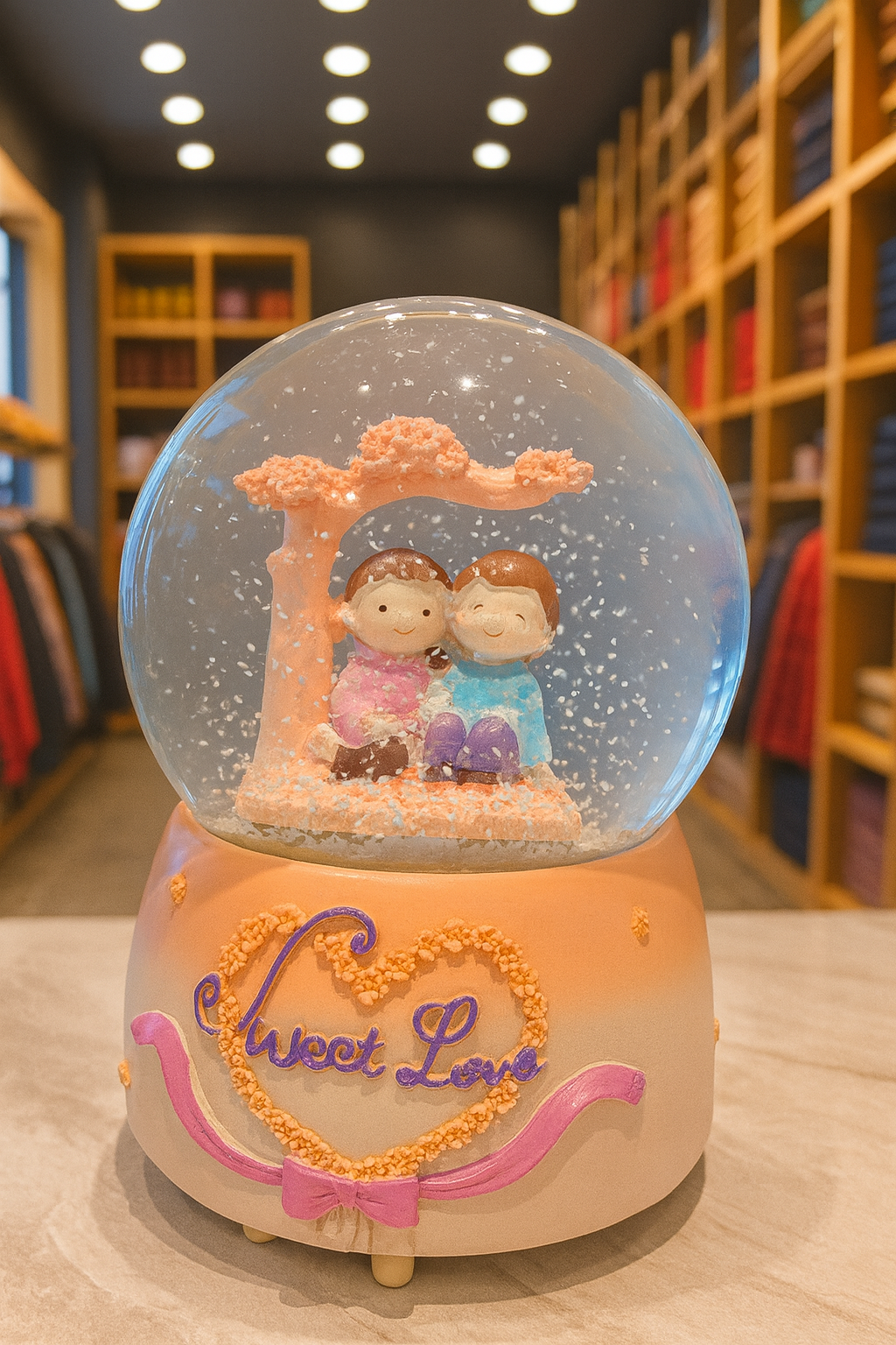Detaylar: Küre içerisinde ağaç altında oturan çocuk ve kız figürü; gövdesinde ise taşlarla işlenmiş kalp çerçevesi içinde "Sweet Love" yazısı ve şık bir fiyonk detayı bulunur.