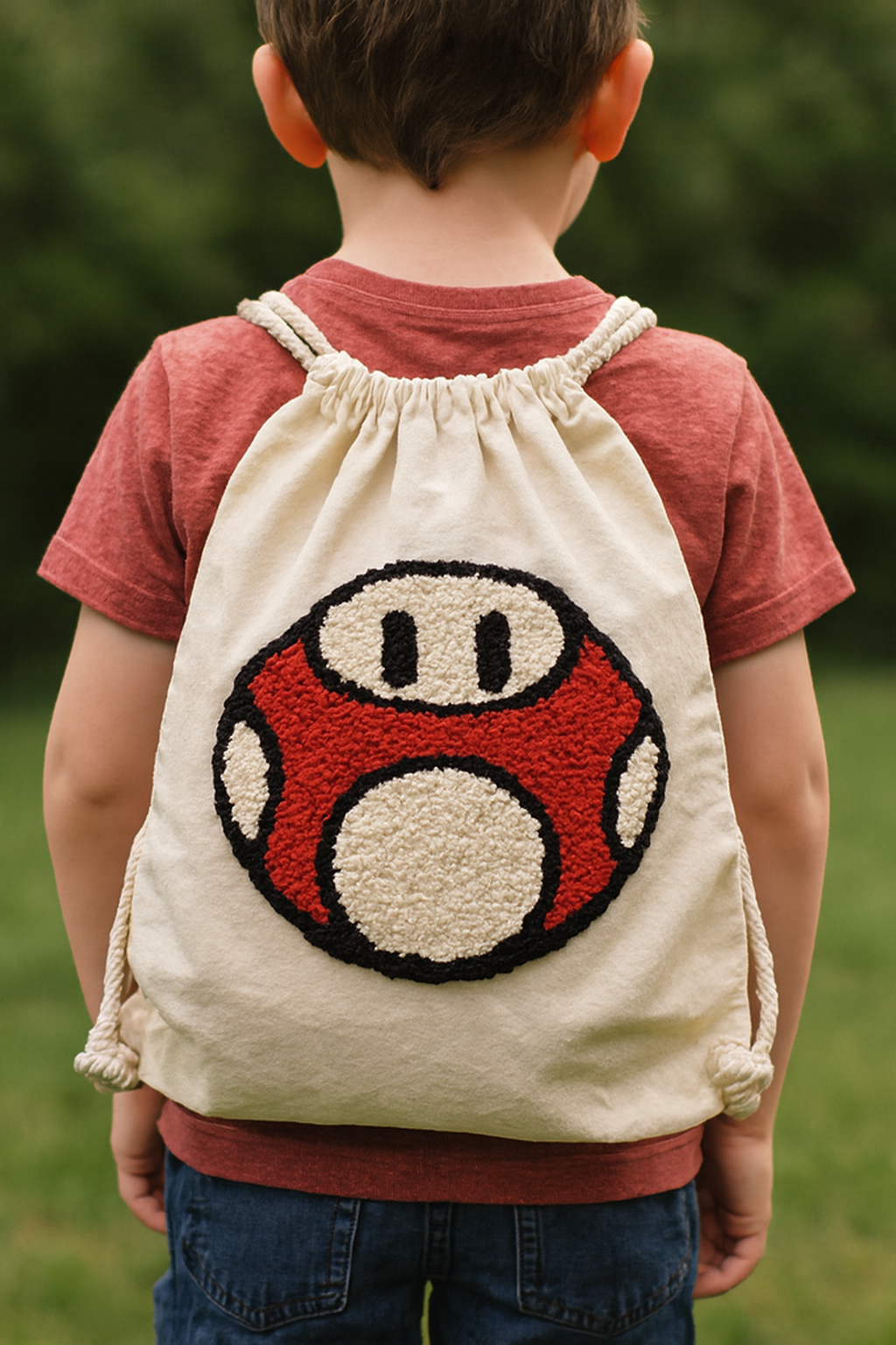 Oyun dünyasının en sevilen ikonlarından ilham alan bu el yapımı punch işlemeli büzgülü çanta ile çocuğunuzun stilini bir üst seviyeye taşıyın! Yüzde 100 doğal ham bez kumaştan üretilen bu çanta, sadece şık değil, aynı zamanda çevre dostu ve dayanıklıdır.